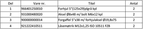 Forside » Reservedele og tilbehør » Hjul og hjuldele » Forhjul til kørestole » 5" Forhjul » Forhjul Gummibane 125 x 29 mm Forhjul Gummibane 125 x 29 mm Bestillingsoversigt: Komplet sæt - Forhjul gummibane 125 x 29 mm DKK 2.885,00 Del 1 - 5" Forhjul, Grå 125 x 29 mm DKK 310,00 Del 2 - Aksel Ø8x48 m/ bolt M6x12 kpl DKK 90,00 Del 3 - Forgaffel 5x38 m/forhjulaksel Ø19,8x75 DKK 1.235,00